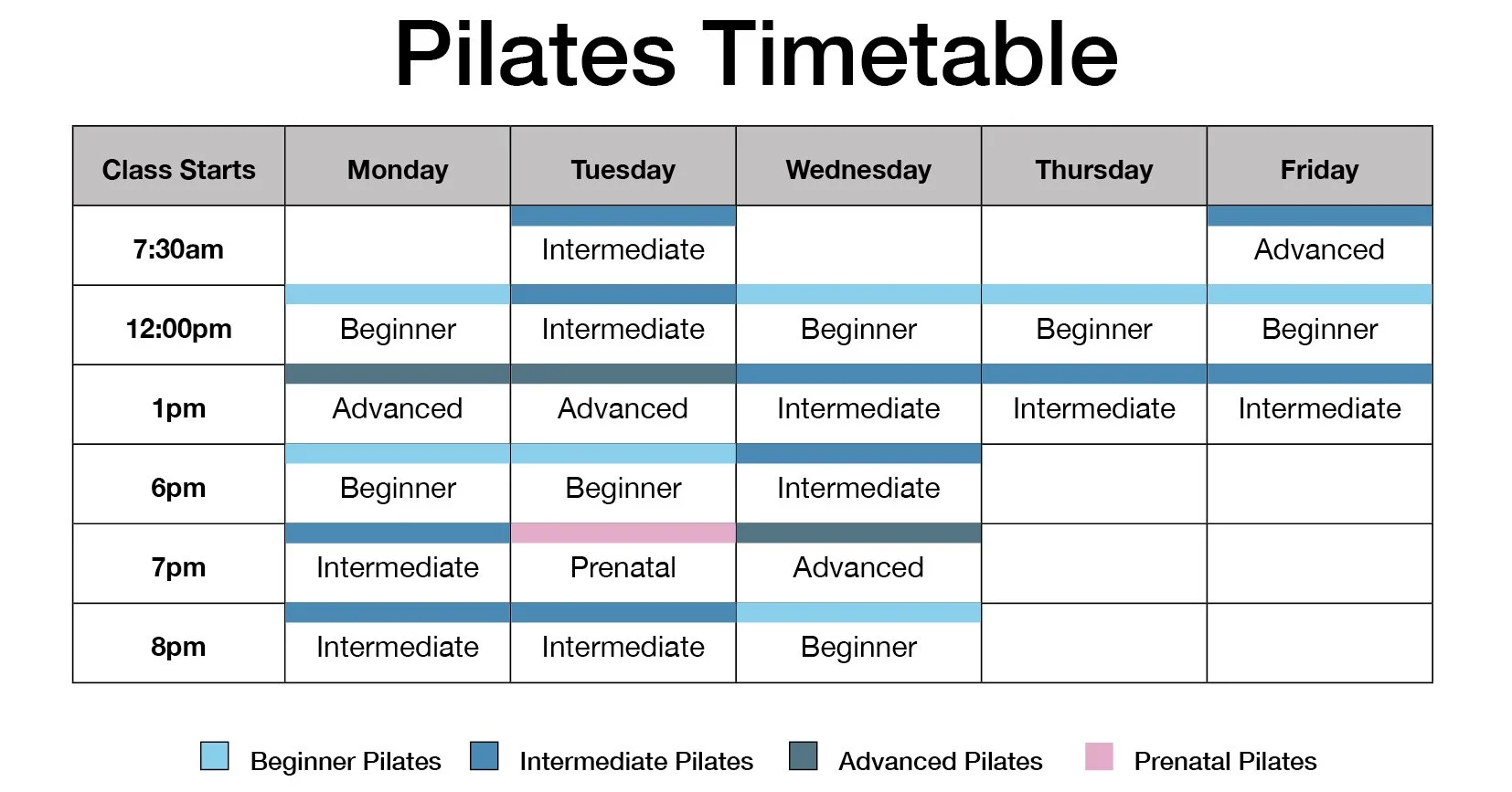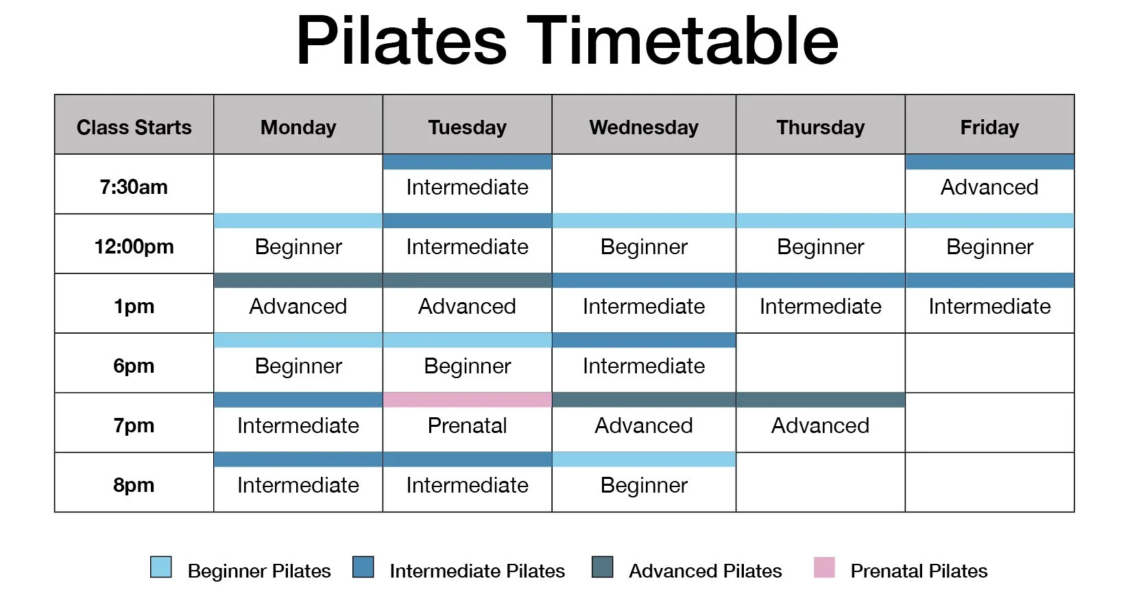 60 minute classes which are all run by instructors trained and experienced in leading Pilates classes of the highest standard.